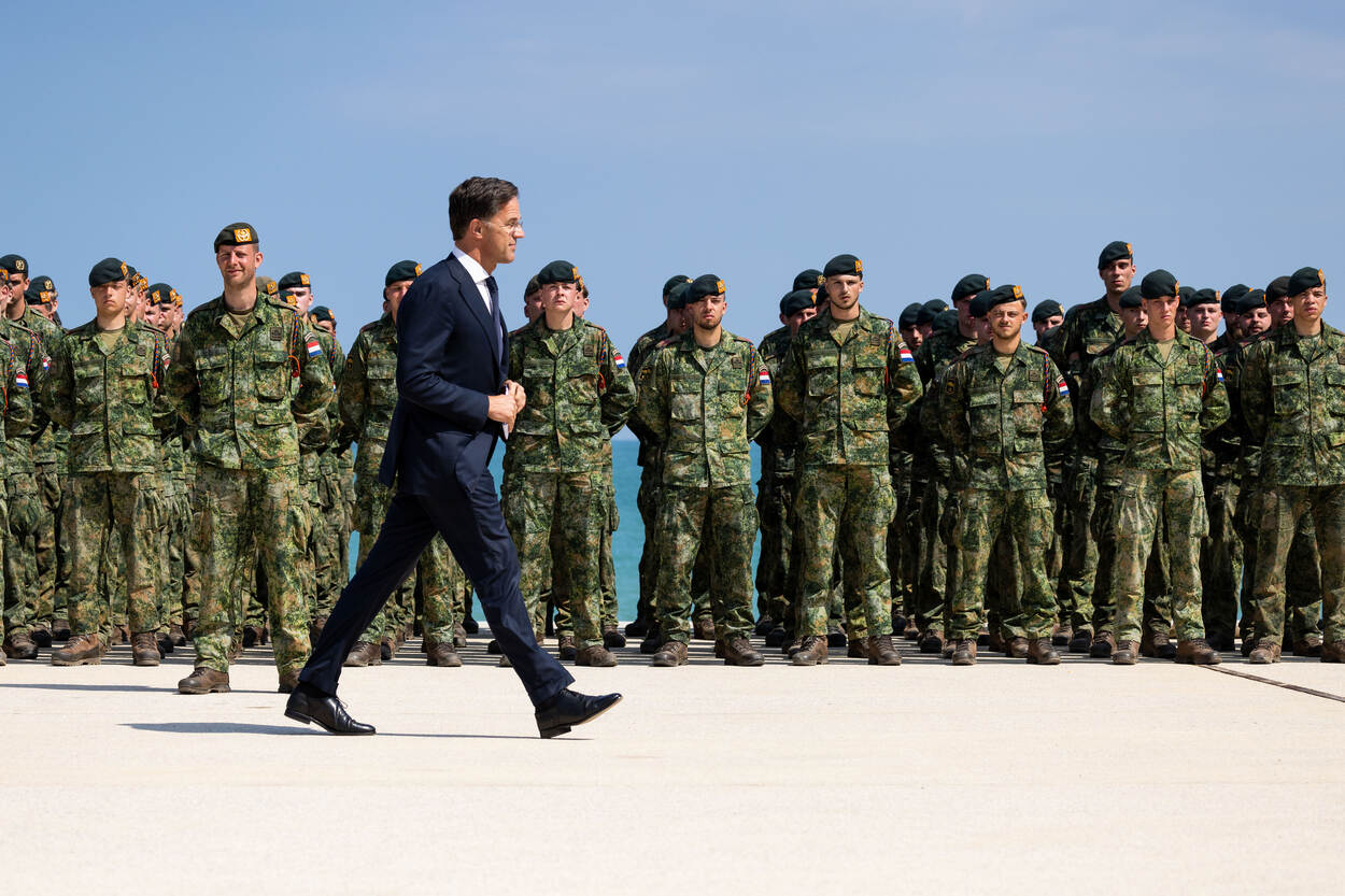 Rutte loop langs een rij militairen