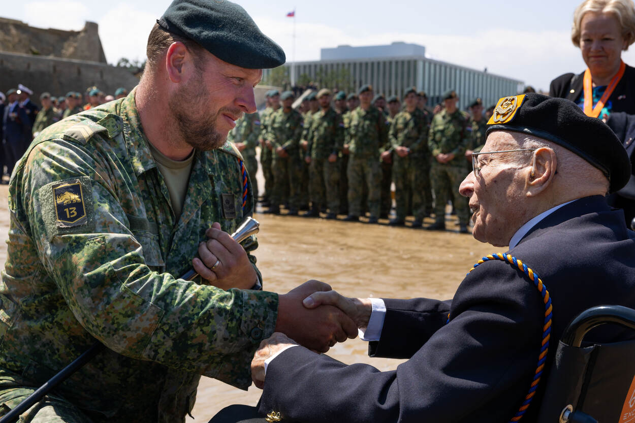 Een kwartier later is fuselier-2 Douwe een van de personen die het koord geknield voor de rolstoel ontvangt van de veteraan. De twee schudden handen. Een mensenleven aan leeftijdsverschil, maar nu verbonden door traditie.