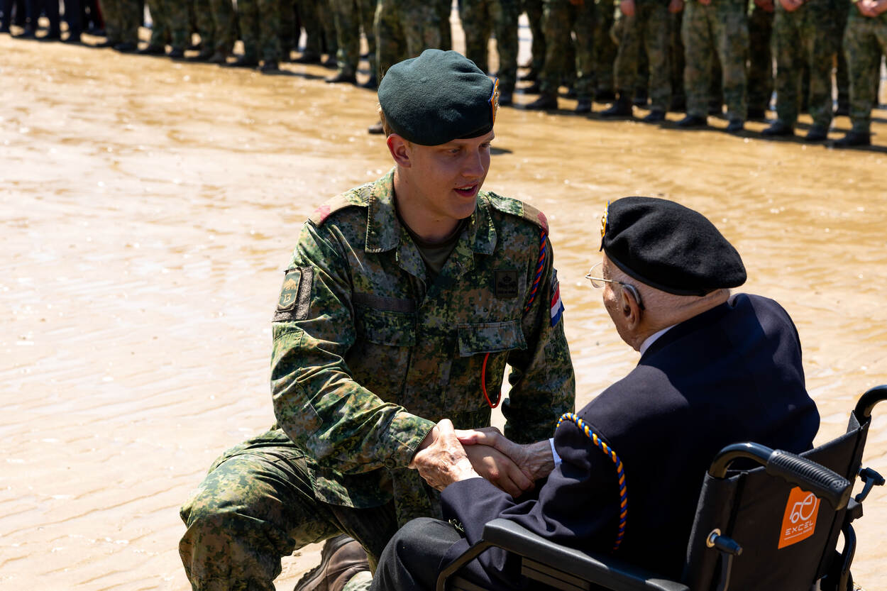 Vanaf de helling die de weg en het zand met elkaar verbinden, duwt een militair de rolstoel van Wolff voorzichtig richting de fuseliers die generaties later bij ‘zijn’ voormalige Prinses Irene Brigade dienen. Een Fransman grijpt het moment aan om de hand van Wolff even vast te pakken. ‘Merci’, zegt hij. Enkele seconden later bedankt een Amerikaan hem eveneens voor zijn deelname aan de bevrijdingsoperatie.
