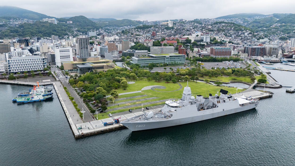 Luchtbeeld van Zr.Ms. Tromp in de haven van Nagasaki.