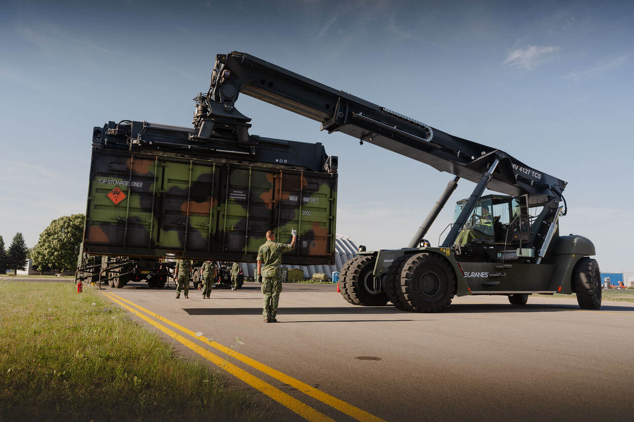 Een militaire containerkraan die een 20 feet-container omhoog tilt.