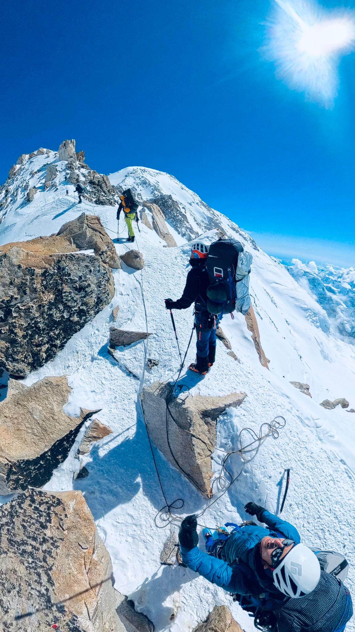 Een van de klimmers op de bergtop met een blauwe hemel en enkele hagelwitte wolkjes als achtergrond