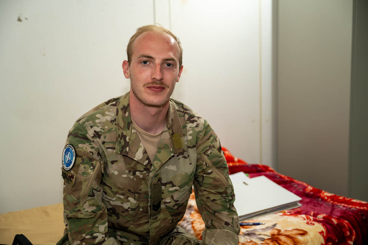 Korporaal Tim kijkt in de camera.