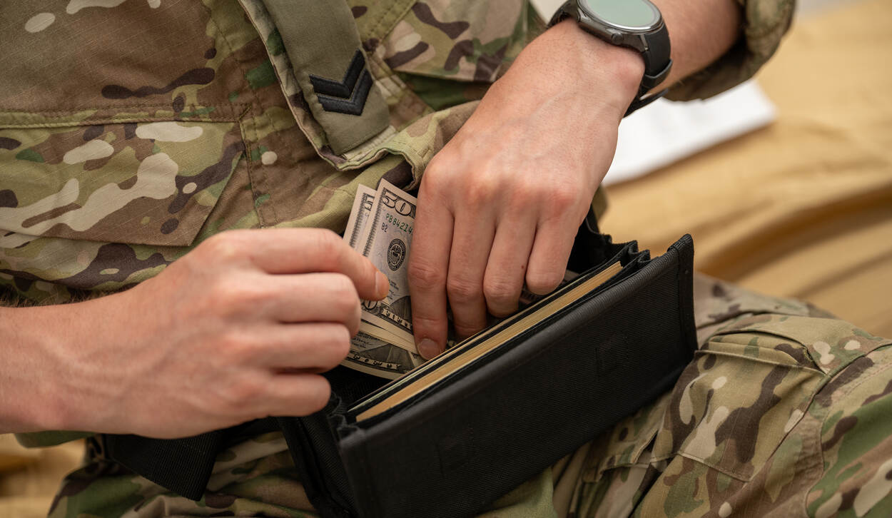 Tims handen reiken in een bruine lederen portemonnee, waaruit diverse dollarbiljetten tevoorschijn komen.