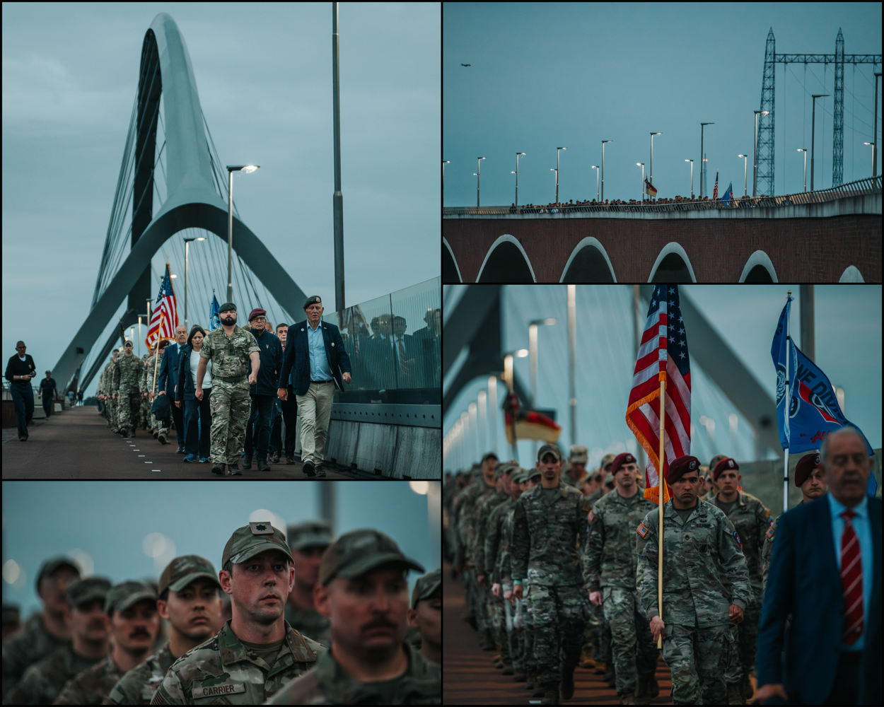 De dag werd afgesloten met een speciale editie van de Sunset March. Deze mars wordt dagelijks bij zonsondergang gelopen over de brug ‘Oversteek’ in Nijmegen, om de geallieerden te herdenken die gesneuveld zijn voor onze vrijheid. Op deze locatie staken op 20 september 1944 Amerikaanse militairen de Waal over tijdens operatie Market Garden. 48 geallieerde militairen lieten hier het leven. De avond voor de start van de 4Daagse wordt deze traditiegetrouw gelopen door verschillende internationale detachementen die verblijven op Heumensoord.