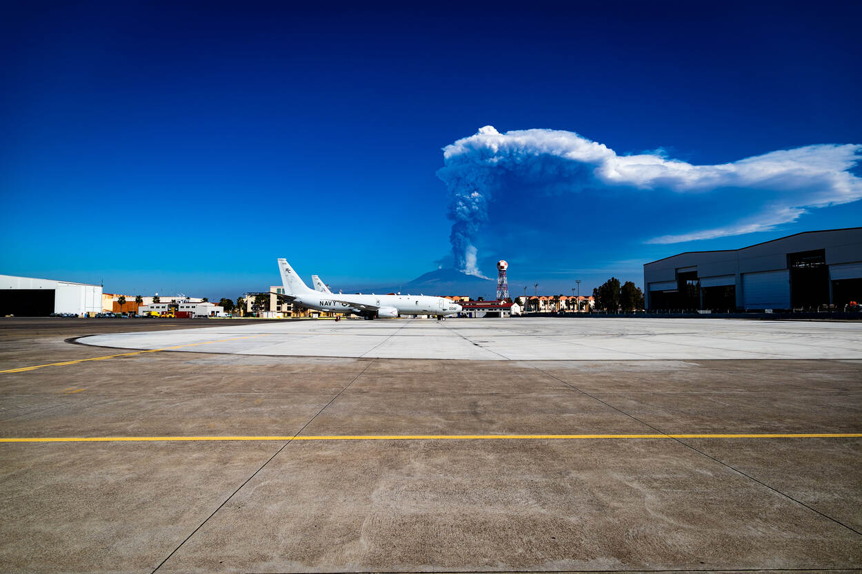 De vliegtuigen op Naval Air Station, hier de P-8 Poseidon, hebben soms last van de uitbarstingen van de vulkaan Etna. Behalve de NISR zijn ook Amerikaanse en Italiaanse eenheden op Sigonella aanwezig.