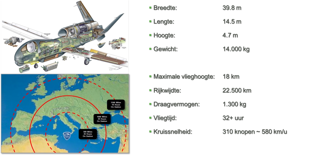 Met een lengte van 14,5 meter en een spanwijdte van bijna veertig meter kan dit toestel langdurig (dertig uur en 22.000 kilometer) en op grote hoogte (achttien kilometer) opereren. Dat heet HALE, wat staat voor high-altitude long endurance. Langer en hoger dan bijvoorbeeld ‘onze’ MQ-9 Reaper, wat dan weer een MALE UAS (medium altitude) is.