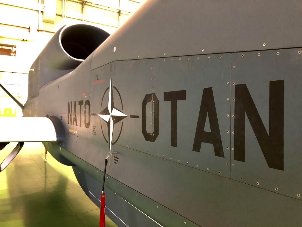 De zijkant van de RQ-4 met de opschriften NATO en OTAN, de Franse afkorting van de NAVO.