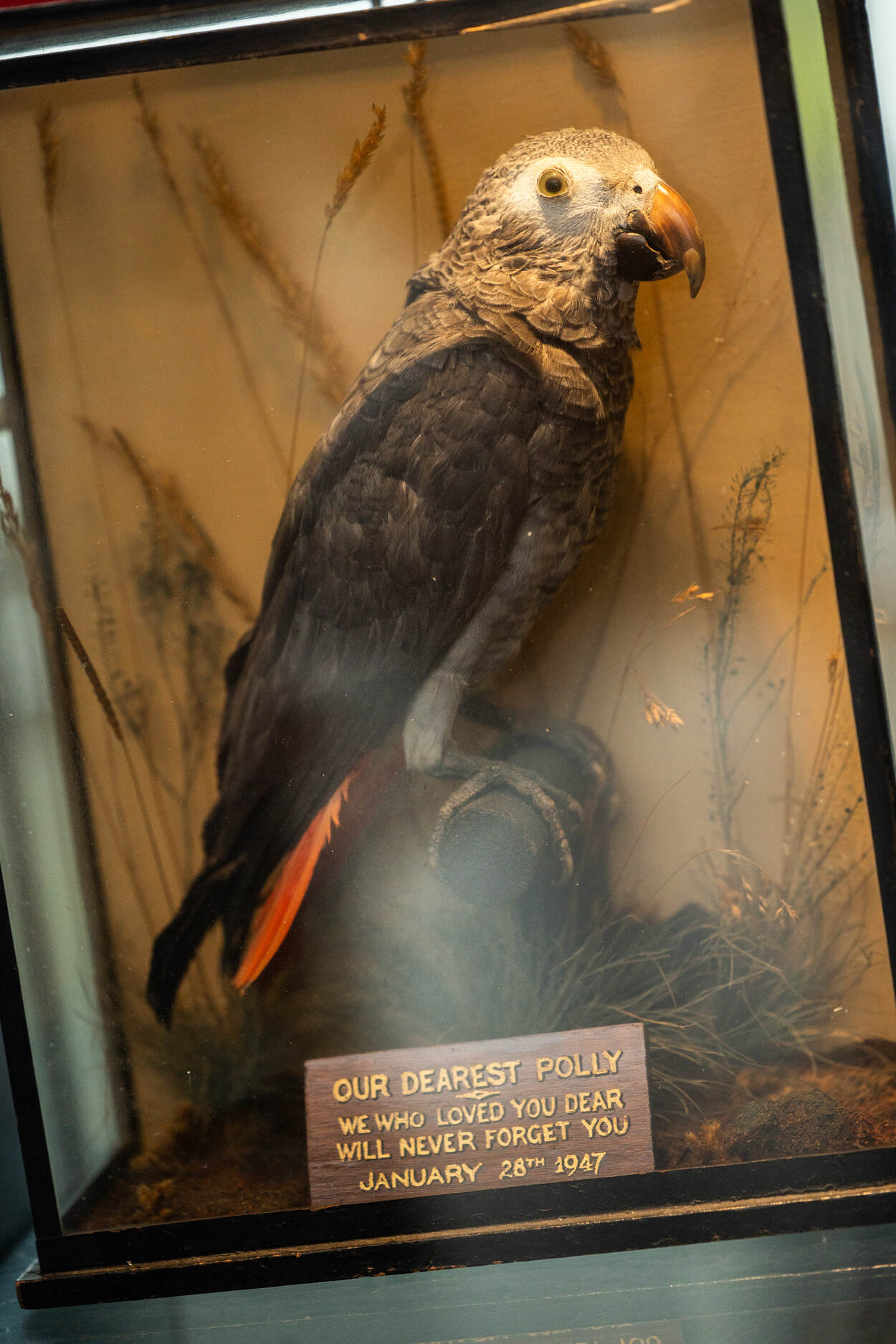 Een grote fotolijst met daarin een opgezette roodstaartpapegaai en de tekst: ‘Our Dearest Polly, we who loved you dear will never forget you. January 28th 1947.’