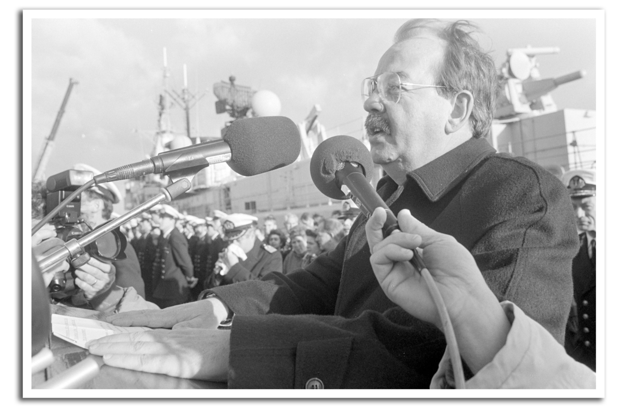 ‘We varen in gedachten met u mee’. Defensieminister Relus ter Beek spreekt op de kade in Den Helder voor het vertrek van de schepen naar de Perzische Golf.