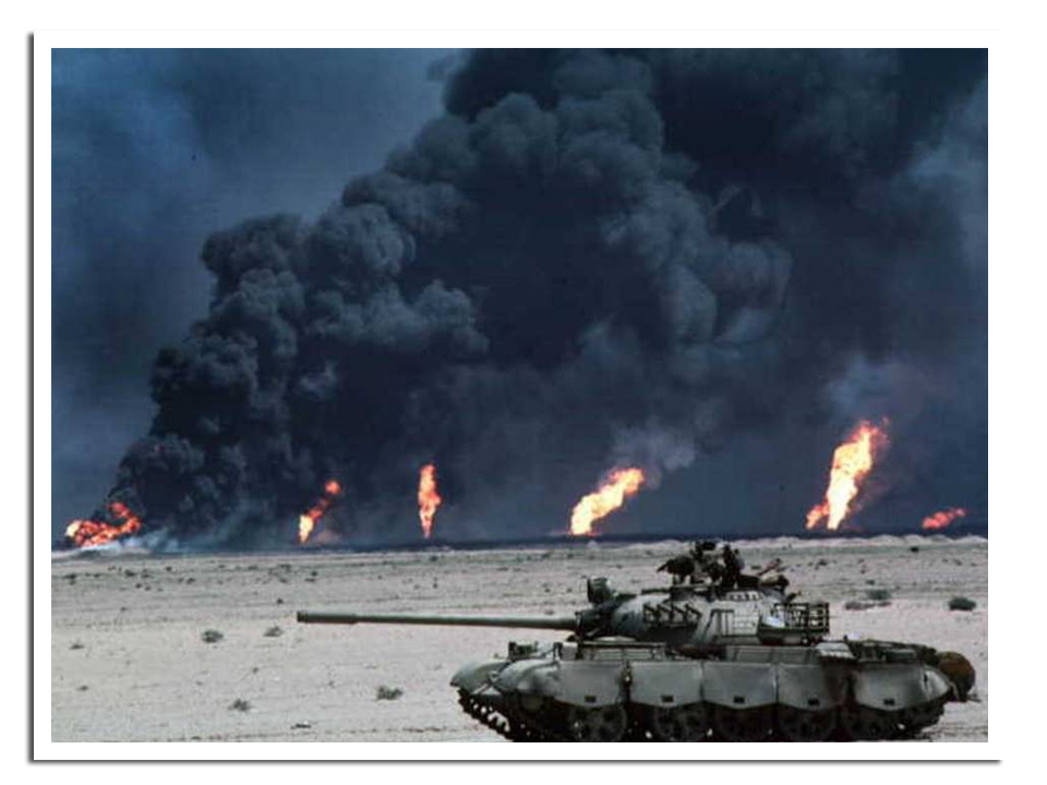 Iraakse tanks in Koeweit met op de achtergrond brandende olievelden.