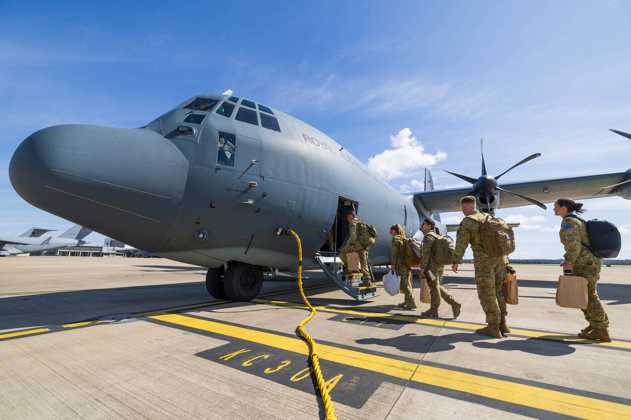 Australische militairen gaan aan boord van een C-130J Hercules.