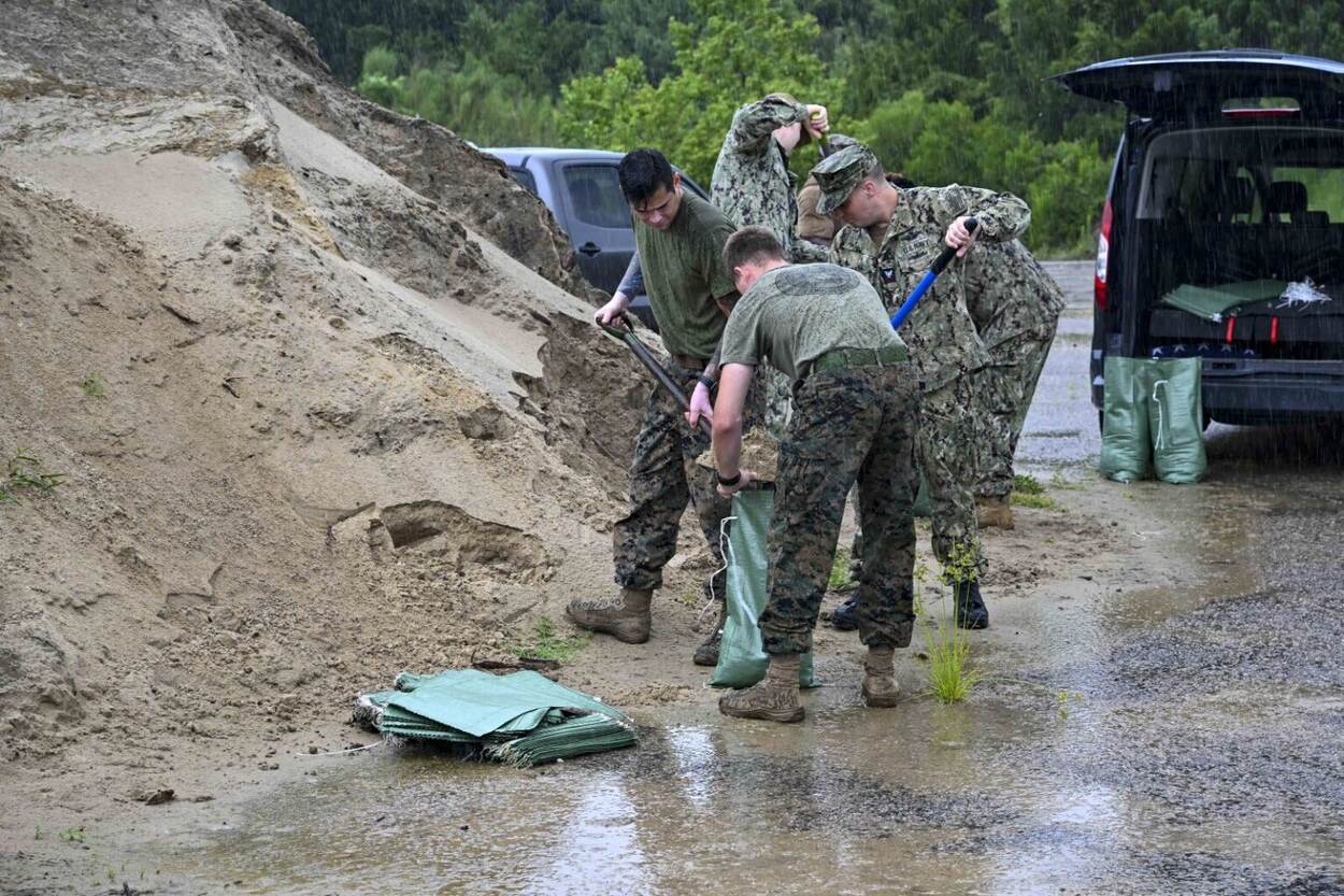 Amerikaanse militairen vullen zandzakken als voorbereiding op de komst van de orkaan Debby.