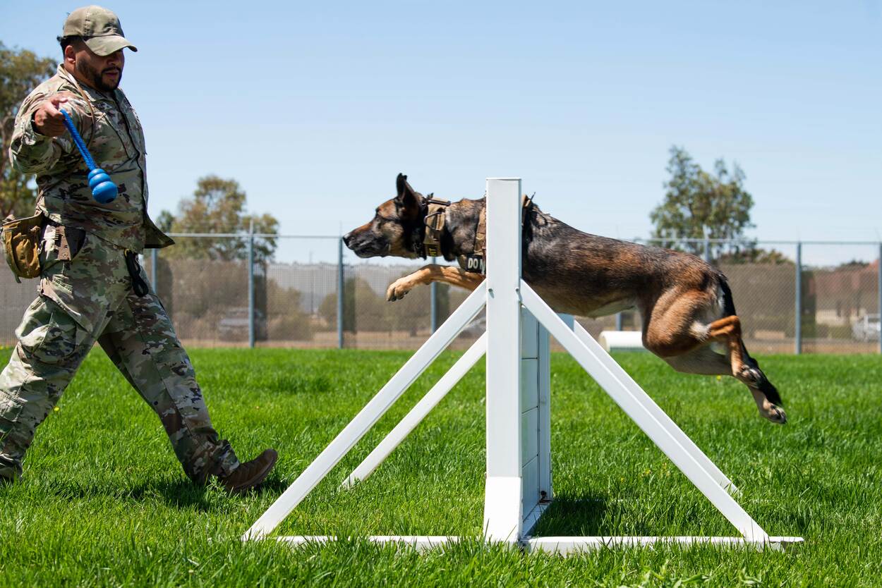 Het was Wereld Hondendag, afgelopen maandag. Reden te meer om trouwe viervoeters in het zonnetje te zetten. In dit geval Daria, die samen met haar baasje van de luchtmacht Andrew Melis een parcours loopt op Travis Air Force Base in Californië. Military Working Dogs, zoals ze worden genoemd, zijn getraind om verdachten in bedwang te houden of af te schrikken. Afhankelijk van hun opleiding kunnen ze ook explosieven, verdovende middelen en andere schadelijke materialen detecteren. De Amerikaanse strijdkrachten kiezen uit drie rassen voor verschillende acties: de Belgische of Mechelse herder (Malinois), de Duitse herder en de labrador.