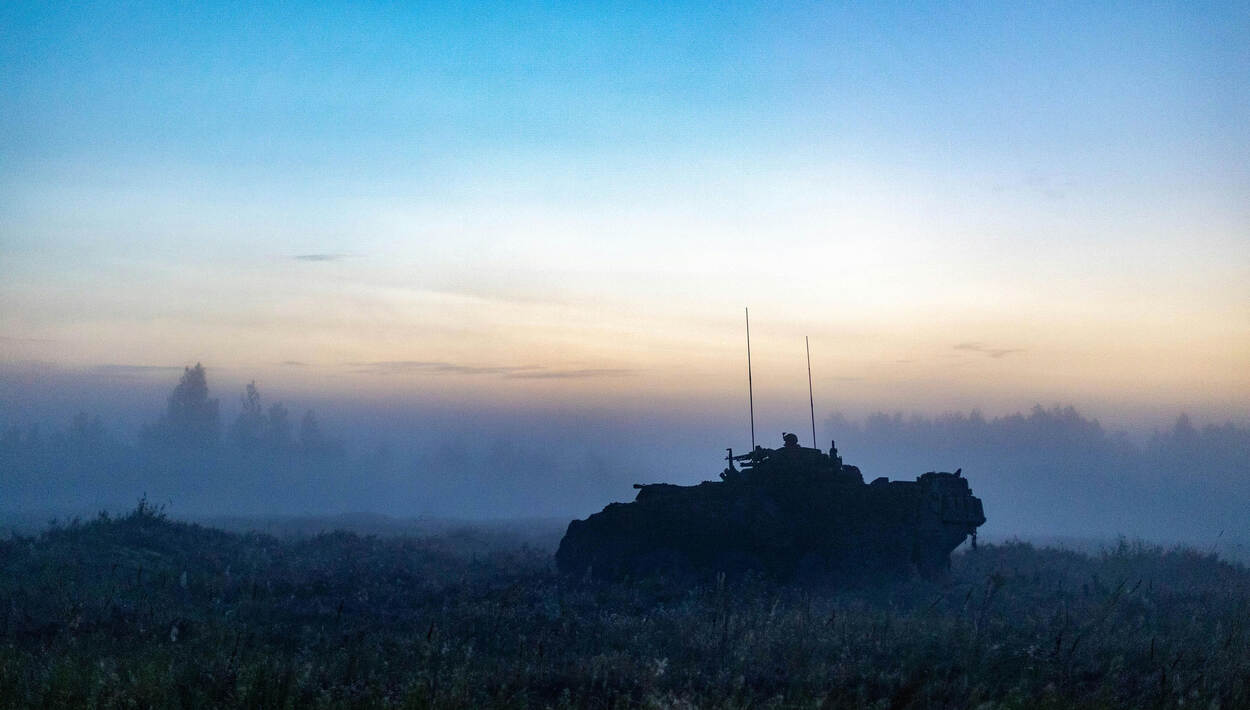 Een Amerikaans pantservoertuig patrouilleert bij zonsondergang. Het voertuig maakt deel uit van de OPFOR (opposing forces, de zogenaamde vijand) tijdens de NAVO-oefening Paladin Strike op de militaire basis Ādaži; de thuisbasis van de multinationale gevechtsgroep van de NAVO in Letland. De oefening, waarbij zware artillerie en luchtdoelartillerie worden ingezet, geldt als voorbereiding op de mega-oefening Silver Arrow volgende maand.