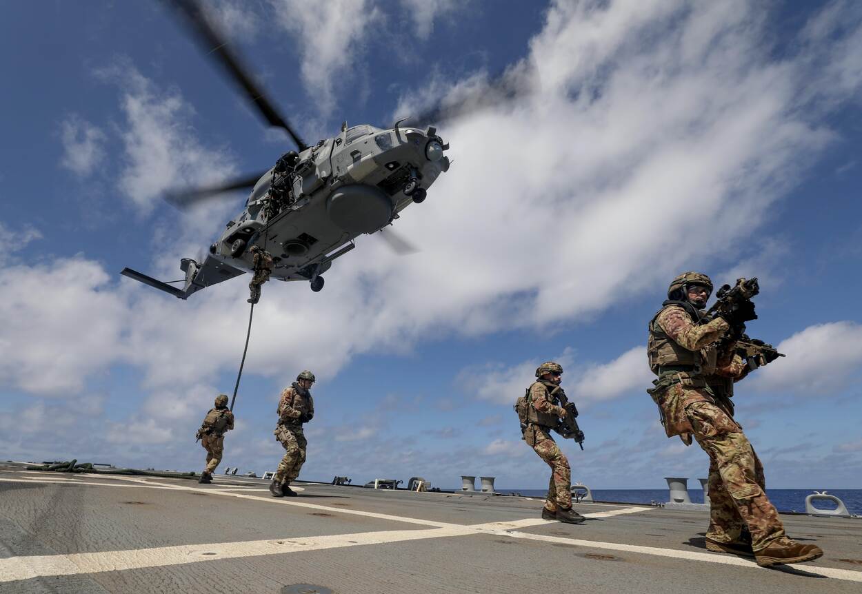Italiaanse mariniers van de San Marco Marine Brigade fastropen (dalen af) vanuit een NH90 op de Amerikaanse destroyer USS Dewy (DDG 105), een schip van de Arleigh Burke-klasse. De oefening vond plaats in de Filipijnse Zee. De Dewey maakt deel uit van Destroyer Squadron (DESRON) 15, het grootste squadron van de marine en een belangrijk onderdeel van de Amerikaanse zevende Vloot. De foto werd genomen door matroos 1e klas Greg Johnson.