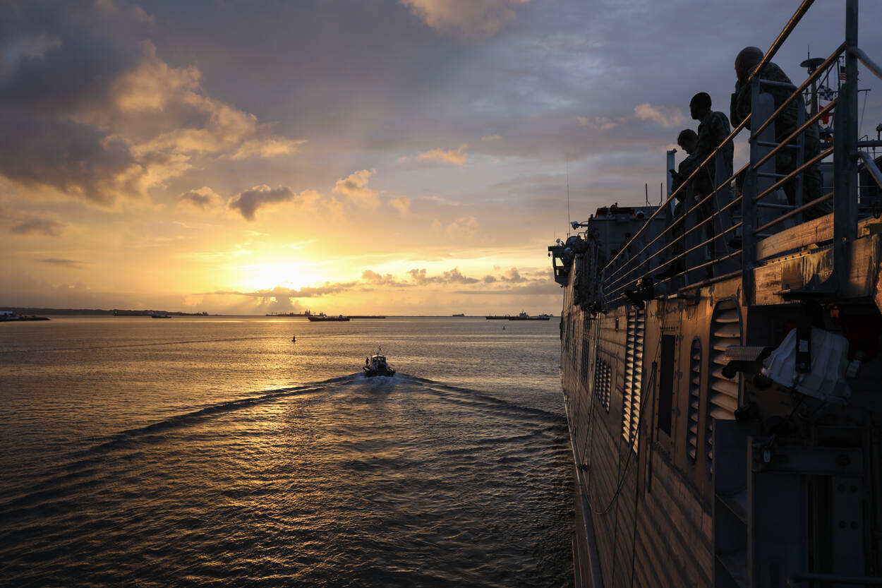 Met de ondergaande zon op de achtergrond zien opvarenden van USNS Burlington de boot van de loods wegvaren.