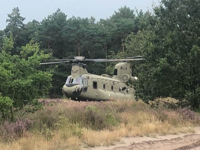 Een Chinook vertrekt in de bosachtige omgeving van de Oirschotse Heide