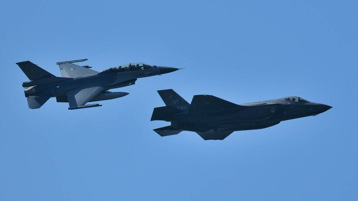 Een F-35 en een F-16 vliegen naast elkaar door de lucht.