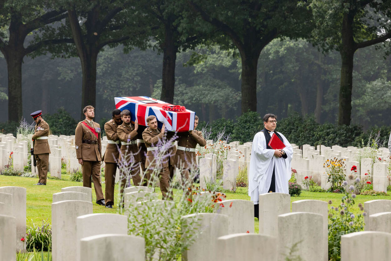 Het zijn de Britse regimenten die de uitvaart verzorgen en hun draagploegen die de kisten naar de juiste plek begeleiden. Jonker: “Het klinkt gek, maar we zien deze herbegrafenissen ook als iets feestelijks. We hebben een moeilijke tijd mooi kunnen afronden en de gesneuvelden het respect gegeven dat ze verdienen.”