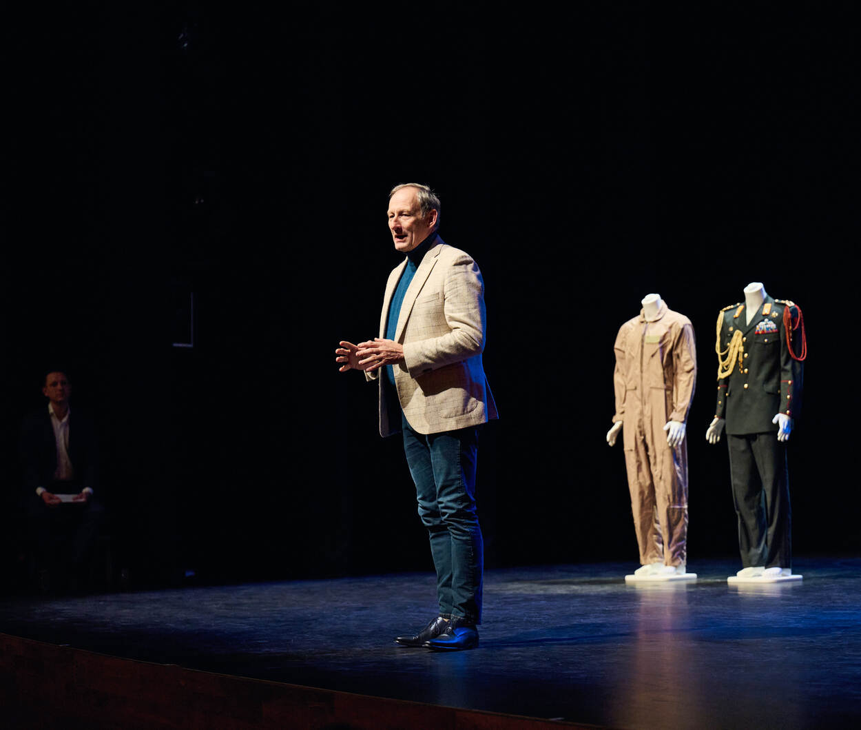 De twee oud-generaals doen de theatershow in samenwerking met journalist Jos de Groot (links).