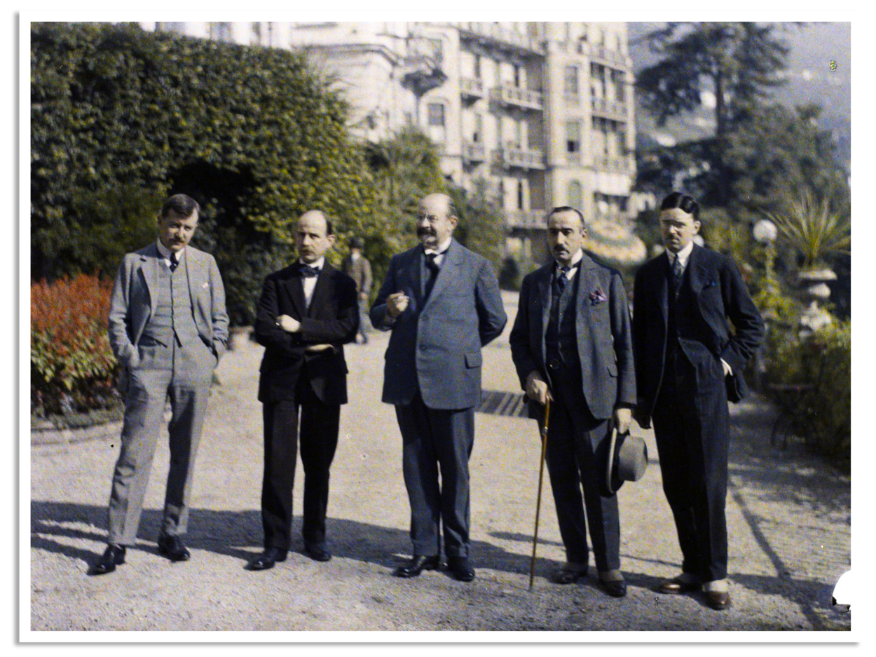 Ingekleurde foto van de Belgische delegatie in Locarno, met in het midden minister Emile VanderVelde.