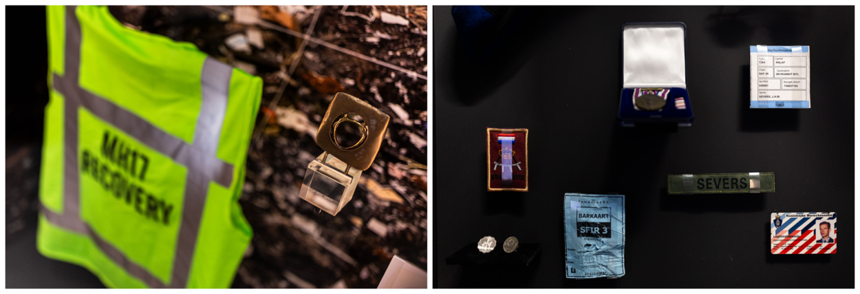 Naast de tijdlijn en het grote, zwarte scherm zijn er een aantal aparte vitrines met unieke objecten te zien. Zoals het gele hesje dat de marechaussee droeg in Oekraïne toen er na de MH17-ramp gezocht werd naar menselijke resten. Maar ook persoonlijke eigendommen van Jeroen Severs, de wachtmeester die in Irak om het leven kwam. “Die spullen van Jeroen raken mij”, vertelt Van Susante. “Ik heb zijn ouders gevraagd of wij die objecten mee mochten verhuizen. In een iets andere opstelling hebben die hier ook weer een heel mooi plekje gekregen.” Conservator Van Brakel is het meest geraakt door de MH17-spullen. “Dat vind ik een heel iconisch onderdeel van de moderne geschiedenis. We hebben er een hele vitrine aan gewijd.”