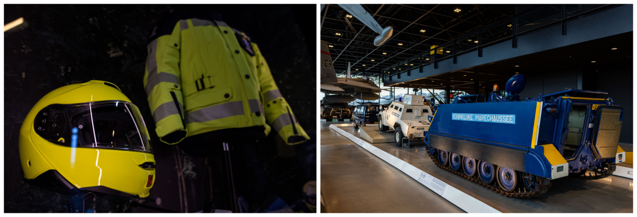 Ook is er ruimte gemaakt voor nieuwe stukken die nog niet in de collectie te zien waren en zo nieuw zijn dat ze ongedragen in het museum hangen. Zoals de nieuwe High Visibility-kleding voor motorrijders. Dat die spullen te zien zijn, kon tot stand komen door de goede samenwerking met de marechaussee. “Zo wilden wij bijvoorbeeld een nieuwere uitrusting van de BSB. De marechaussee kon dat niet zomaar leveren, maar ze hebben dus een actief BSB’er opdracht gegeven om zijn uitrusting in te leveren. Hij stond dus letterlijk een half uur geleden even de details goed te trekken van de pop die wij neer hebben gezet. De marechaussee heeft ook toegezegd dat ze mee willen werken als wij tussendoor updates willen.”