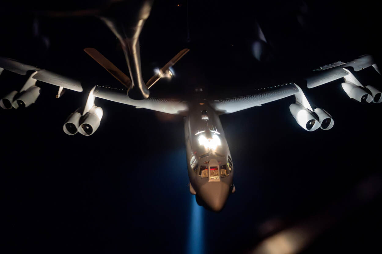 Het is geen alledaags tafereel: een B-52H Stratofortress van de Amerikaanse luchtmacht die een KC-135 Stratotanker nadert om bij te tanken. De foto van sergeant 1 Jackson Manske is genomen boven het verantwoordelijkheidsgebied van het Amerikaanse Central Command. (AFCENT). Waar dat precies is, dat is onduidelijker dan deze fraaie foto.