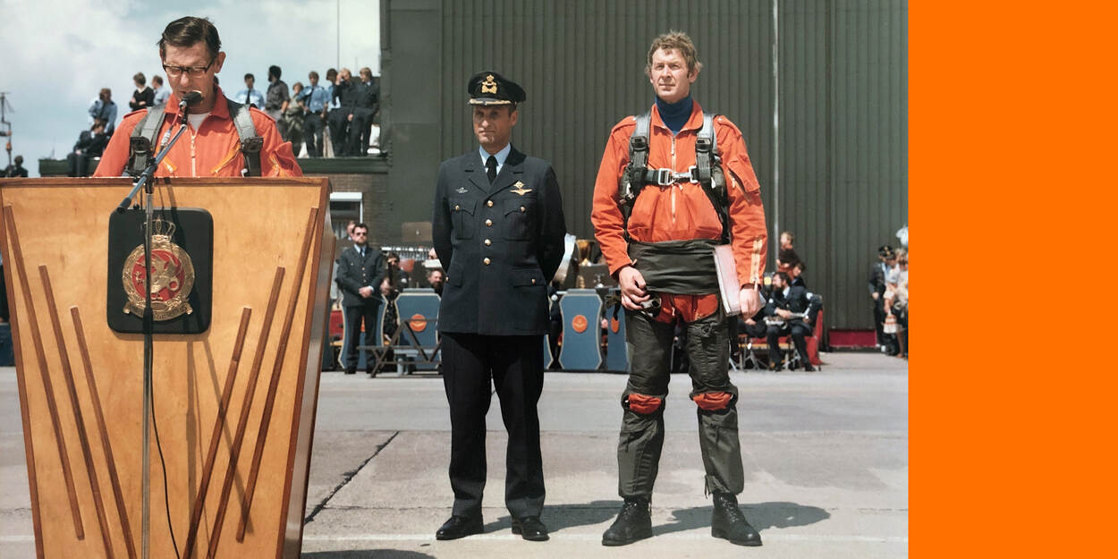 Sneek in vroeger jaren, staand naast een spreekgestoelte, in een rood vliegerspak. Foto links: uit archief Sneek