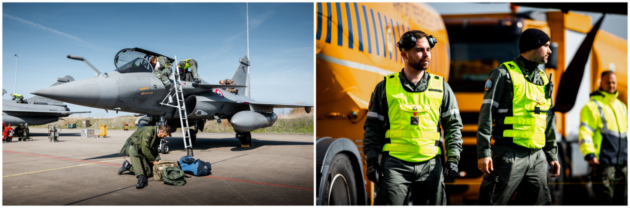 Links: Een vlieger werkt zijn boekwerk bij met op de achtergrond een Rafale waarop grondpersoneel aan het werk is. Rechts: Brandstofpersoneel rolt een tankslang uit een gele tankwagen.