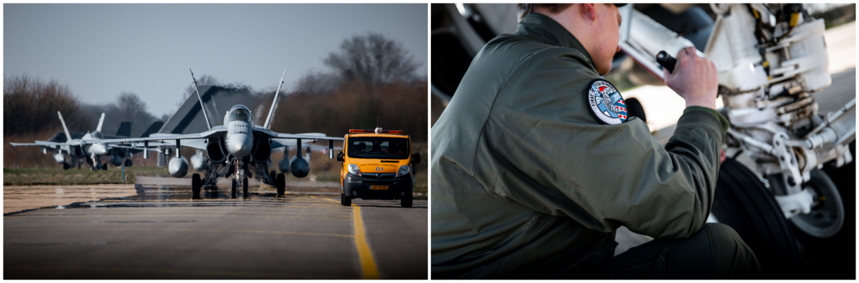 Links: Een geel busje rijdt voor een aantal grijze jachtvliegtuigen uit. Rechts: Grondpersoneel werkt aan het landingsgestel van een vliegtuig.