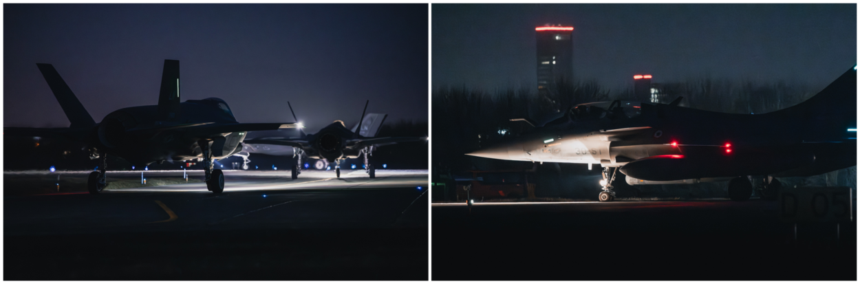Links: F-35’s taxiën het donker. Rechts: Een Rafale staat klaar voor de start. Op de achtergrond de hoogbouw van de stad Leeuwarden.