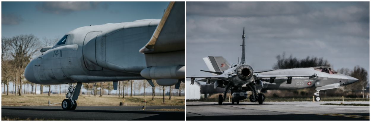 Links: Een Hongaarse Gripen taxiet achter een Deense F-35. Rechts: De neus van een Italiaanse G550.