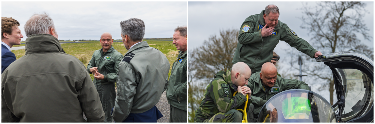 Links: Ook minister van Defensie Ruben Brekelmans, Commandant der Strijdkrachten generaal Onno Eichelsheim en premier Dick Schoof (v.l.n.r.) brachten een bezoek aan de oefening. Rechts: Commandant Luchtstrijdkrachten luitenant-generaal André Steur en de Commandant Aircom generaal James Hecker krijgen uitleg bij een Zweedse JAS 39 Gripen. (Foto’s: sergeant majoor Hilbert Buter)