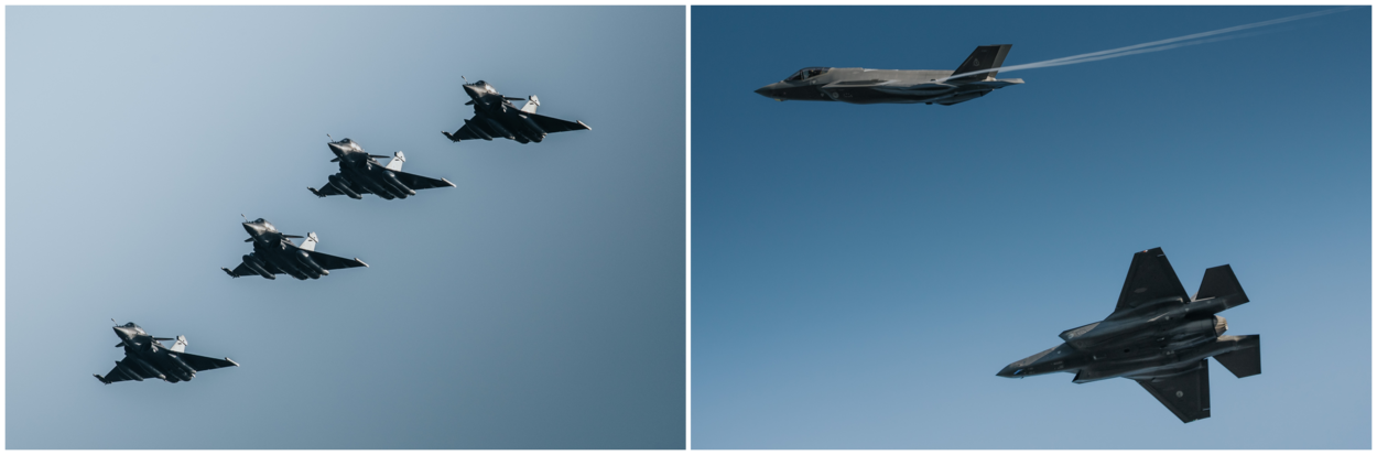 Links: Leeuwarden was onder meer het onderkomen voor Franse Rafales. Rechts: Nederlandse F-35’s vormen samen met de Amerikaanse, Deense en Italiaanse collega’s het 5e generatie luchtmachtdeel in deze oefening.