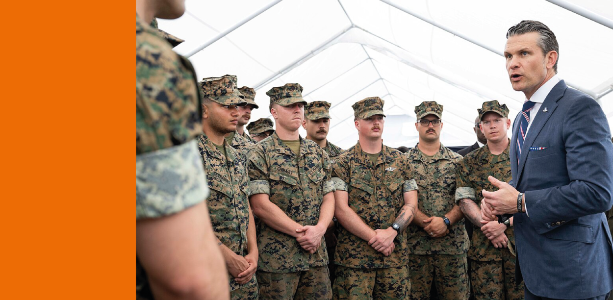 Defensieminister Pete Hegseth draagt een blauw pak en spreekt Amerikaanse militairen toe.