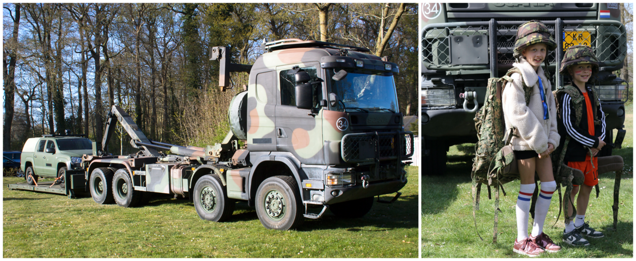Onze noordelijke fotografen Harry Hulshof en André Jans mogen natuurlijk niet ontbreken bij de grootse viering van 80 jaar bevrijding, de Drenthe Liberty Tour. Zonder dat ze het van elkaar wisten, liepen beide trouwe inzenders in het dorpscentrum van Westerbork, waar Defensie een tent had neergezet met een viertal voertuigen. “Daar dus wat foto's kunnen schieten. De foto (links, red.) die mezelf het meeste aansprak is een Scania WLS 8X met vlakke laadvloer. Op deze vloer had men een Amarok vastgesjord”, laat Harry weten.