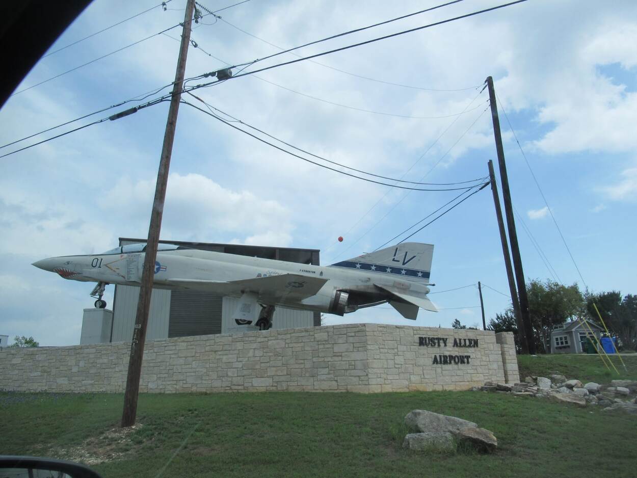 De navigatie leidde haar auto van de snelweg naar een heel klein plaatsje. “Tot onze grote verbazing stonden we opeens op het gemeentelijk vliegveldje Rusty Allen Airport. Vlak voor de onbeveiligde toegang zagen we deze Phantom op een standaard.”
