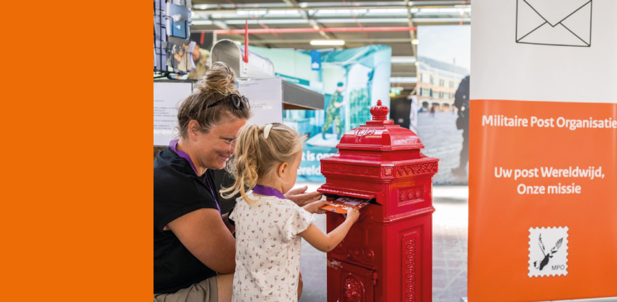 Een blonde dame met een knot op haar hoofd staat voor een rode brievenbus met een klein meisje. Samen stoppen ze een brief in de brievenbus. Daarnaast staat een banner met de tekst ‘Militaire Post Organisatie. Uw post, wereldwijd, onze missie.”