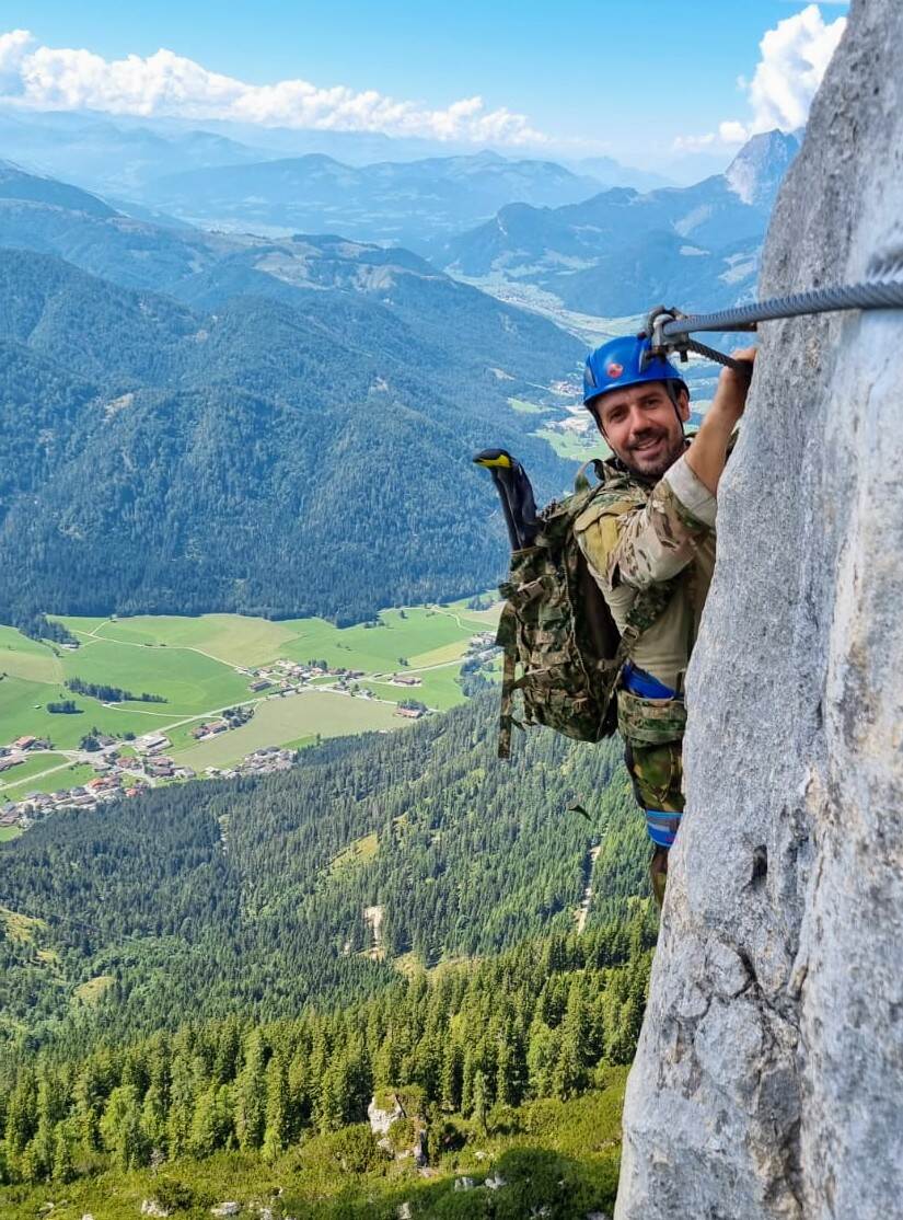 Sergeant-majoor Kaspers tijdens het beklimmen van een berg.