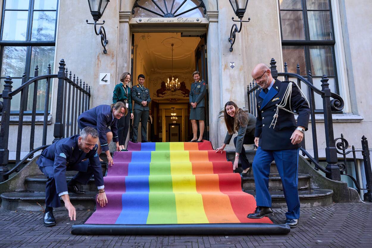 De regenboogloper wordt uitgerold voor de deur van het ministerie.