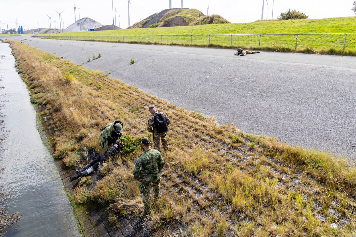 Militairen liggen op de buik om een pop uit het water te trekken.