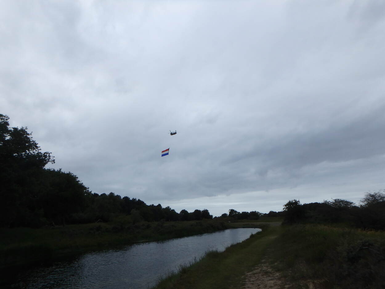 Een Chinook vliegt boven de Amsterdamse Waterleidingduinen met een vlag eronder.