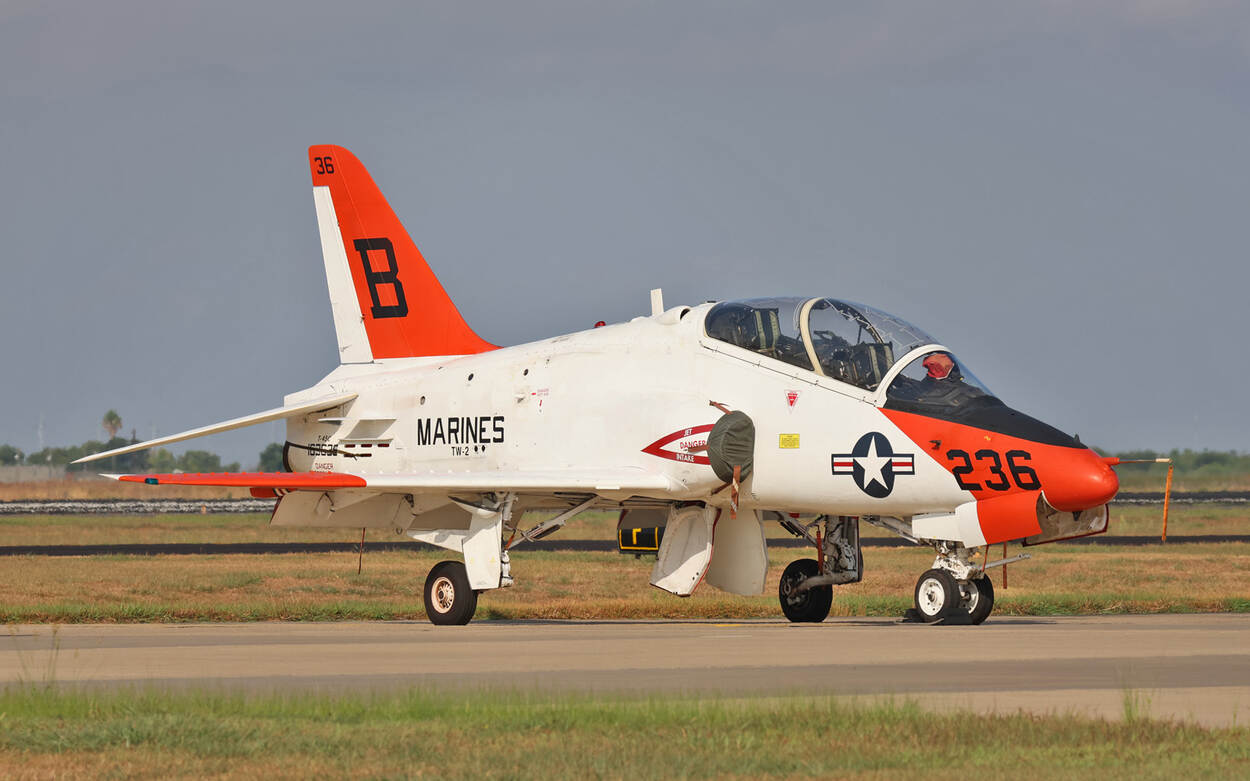 Wel in beeld: Legacy Hornets (rechts) van de VMFA-112 'Cowboys'. “Waarschijnlijk de laatste USMC (United States Marine Corps, red.) unit die overgaat op de F-35”, weet Coert. En ook: een T-45C Goshawk (links). Coert zag er onderweg verschillende, zoals deze op Corpus Christi International Airport. Geen slechte vangst voor drie weken toeren.