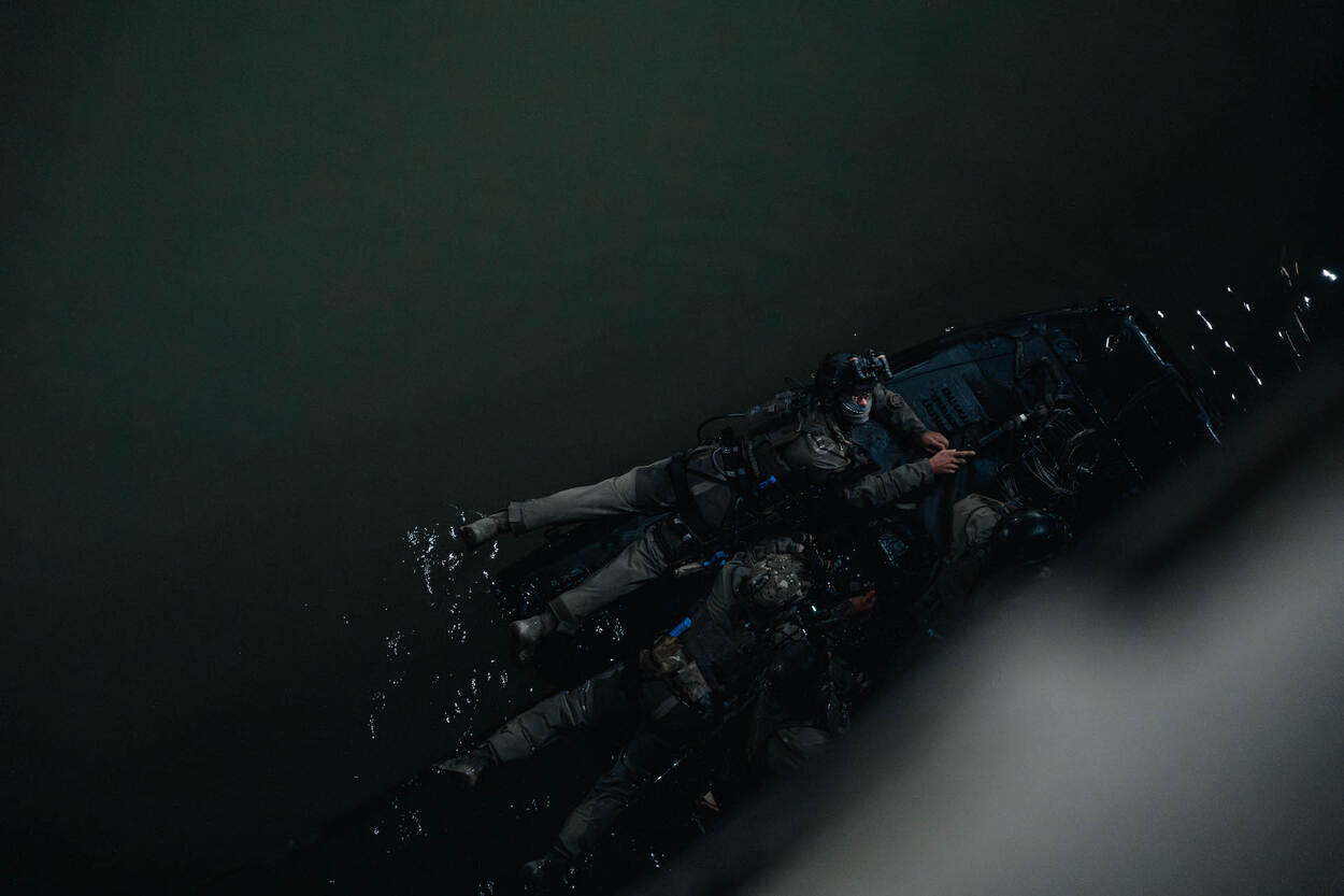 Dat kennismaken gebeurde tijdens het eerste deel van de oefening. In die week konden de operators wennen en bepaalde procedures zorgvuldig oefenen. De week erna ging het los en draaiden de special forces verschillende scenario’s verspreid over Nederland en België. Alles op de grens van land en zee. “Dat maritieme karakter moeten we beoefenen om er klaar voor te zijn”, zegt Eric. “Het is gewoon een andere tak van sport.”