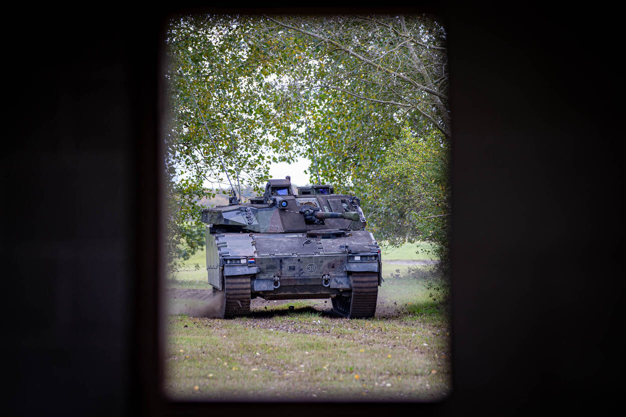 Opgepast! Wie deze CV90 (Combat Vehicle 90) op zich af ziet komen, doet vanzelf een stapje naar achteren. Met een maximumsnelheid van zeventig kilometer per uur is deze kolos sneller bij je dan je denkt. In dit infanteriegevechtsvoertuig passen naast de chauffeur, boordschutter en commandant nog eens zeven militairen. Na een paar keer ‘zagen’ - rap naar voren en achteren rijden om de vijand te verrassen en zelf zo veilig mogelijk te blijven - is het tijd om uit te stijgen. Infanteristen die achterin de bak zitten, verlaten zo snel mogelijk de CV90 om een pand in Marnehuizen te betrekken. Bij het uitstijgen is één ding heel belangrijk. Om veilig het pand te bereiken, moeten de infanteristen continu druk zetten op de vijand. Dat betekent dus: snel voorwaarts gaan, wapens richten en volop focus. Het liefst ongezien - en anders onder dekking verplaatsen - is een must. Zo is de kans op vijandelijk vuur incasseren het kleinst. Dat doen de pantserinfanteristen onder meer door een rookgordijn op te werpen. Letterlijk. Zo ziet een eventuele vijand pas op het allerlaatste moment waar ze zijn. We blijven even hangen in de gele rook. Het bestormen van een pand is één. Maar het betreden ervan is soms knap lastig. Gelukkig heeft de Bravo-compagnie pantsergenisten binnen de gelederen. Zij helpen op minder subtiele wijze toegang tot gebouwen te verkrijgen. Dichte deur? Geen probleem. Dan maar via het raam. Met een harde klap barst deze ruit in vele duizenden stukken en splinters. Tijdens dit zogenaamde ‘breachen’ staan de pantserinfanteristen stil en zijn ze dus kwetsbaar. Daarom letten collega’s continu op dreigingen van buitenaf. Bij het zuiveren van de panden zijn de militairen volledig op elkaar aangewezen. Van elke gang, elk kamertje en elk hoekje moeten ze zeker zijn dat daar geen vijand is. Optimale focus is daarom vereist. Om te voorkomen dat er slachtoffers vallen onder het uitgestegen personeel, blijft de CV90 in de buurt. En als er dan toch een gewonde valt, dan komt de CV90 goed van pas. Een pantserinfanterist helpt zijn collega met hoofdwond het gevechtsvoertuig in, zodat die snel naar geneeskundige troepen kan worden vervoerd. “3, 2, 1…” Een enorme klap met een flinke drukgolf in het kielzog klinkt door het oefendorp. Een dichte deur is niet bestand tegen de explosieve lading die de pantsergenie tot ontploffing brengt en breekt in tweeën. Het verrassingseffect speelt een grote rol bij het betreden van gebouwen en dat is hier aardig gelukt.