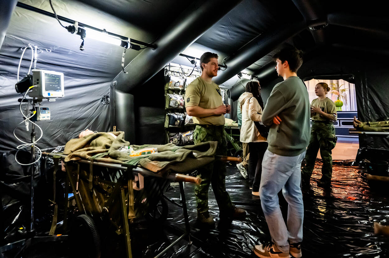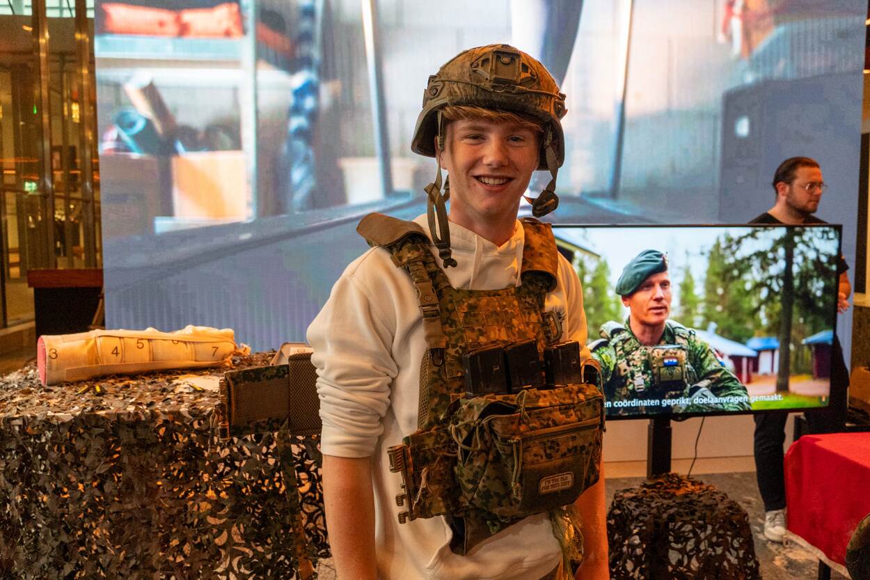 In een hoek bekijkt een jongen door een VR-bril een Apache gevechtshelikopter van dichtbij. Verderop zit een groep tieners achter de computers van het Esports team van Defensie. Daarachter kijkt een vader toe hoe zijn zoon een joekel van een rugzak probeert te dragen. Ondertussen werpen een moeder en dochter een blik op welke functies de marine biedt. Een ander groepje kijkt op dat moment in de opblaasbare medische tent van de landmacht.