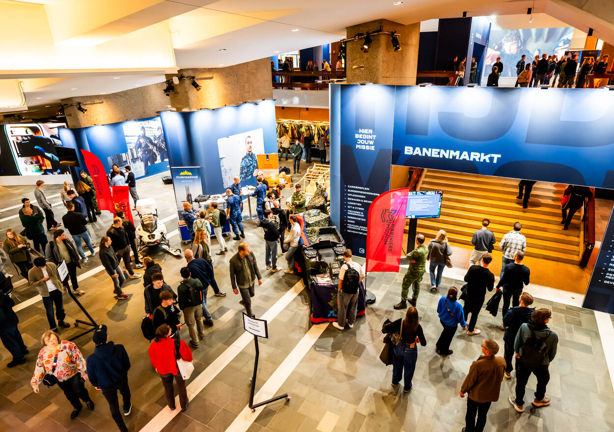 Dat doel is bereikt. Op de beursvloer van de Doelen zijn niet alleen alle krijgsmachtdelen vertegenwoordigd. Elk denkbaar werkveld binnen Defensie presenteert zich. De circa drieduizend bezoekers per dag kunnen in gesprek met defensiemedewerkers uit de zorg, logistiek, cyber en ICT. Maar ook wie meer wil weten over wat het betekent om militair werkstudent te zijn bij Defensity College, of om reservist te worden, kan direct in gesprek.