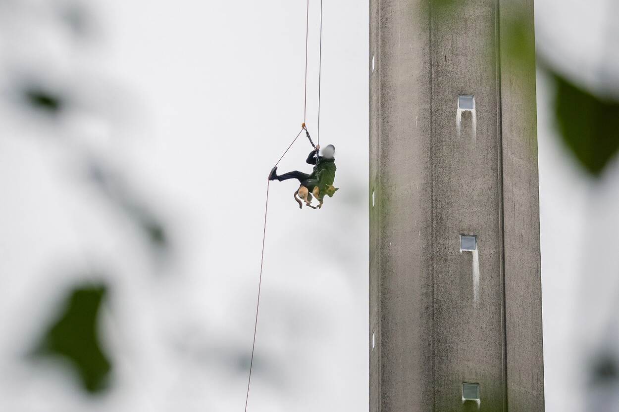 De afgelopen weken stonden in het teken van praktijktrainingen op verschillende locaties in Nederland, waaronder het Airborne Museum in Oosterbeek en het Evoluon in Eindhoven. De praktijkperiode is afgesloten met een examen waarmee de EDD-opleiding wordt afgerond. Maar het spectaculairst was zonder meer deze afdaling. Dan rijst toch de vraag: bestaat hoogtevrees ook bij honden?